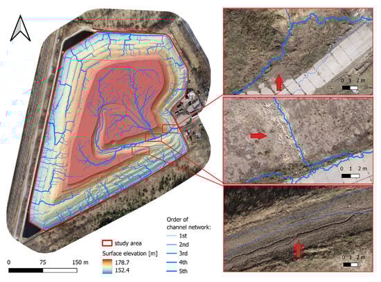 To classify the extracted runoff pathways into hydrologically meaningful groups, the channel network was ordered using the Strahler stream-ordering system, as implemented in the SAGA GIS “Channel Network and Drainage Basins” tool. In this approach, first-order channels represent the initial flow paths generated above the applied flow-accumulation threshold, while higher-order channels emerge when two channels of the same order merge. Consequently, 4th- and 5th-order channels correspond to the main drainage routes, concentrating the majority of surface runoff on the landfill crown. This hierarchical classification enabled the distinction between minor, locally confined flow lines and the dominant runoff pathways that govern the redistribution of surface water across the landfill. The plausibility of the extracted high-order pathways was evaluated using both field observations and selected examples visible on the high-resolution RGB orthophoto map (Figure 7). Although vegetation cover obscured many micro-topographic features, several primary runoff paths coincided with visible indicators on the orthophoto—such as zones of reduced vegetation, darker moist soil patches, and subtle linear surface features formed by shallow runoff. These orthophoto interpretations aligned with in situ observations of wet-soil areas and small erosional grooves recorded during site visits, supporting the validity of the delineated drainage network.