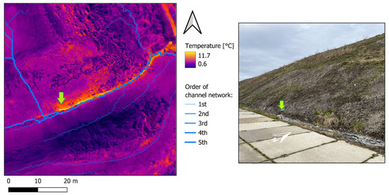 Figure 10 presents a detailed view of the Land Surface Temperature (LST) distribution over a selected section of the landfill cover, overlaid with the drainage network derived from the surface water runoff analysis. The thermal map reveals a clear linear zone of elevated temperature (yellow–orange), which is distinctly warmer than the surrounding surface. This thermal anomaly follows the slope break/bench transition zone, and its most pronounced section is indicated by the green arrow. Field observations confirmed that this anomaly corresponds to leachate seeping through the landfill cover. Leachate typically exhibits higher temperatures than the surrounding soil, especially during early spring when subsurface decomposition processes are active. As the leachate migrates toward the surface, it increases local LST, producing a distinct thermal signature.