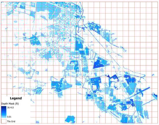 To prepare the data for model training and evaluation, all generated data layers, including the flood extent masks, DTM-derived features (elevation, slope, curvature, etc.), and the ground truth flood depth mask), were spatially aligned using a common coordinate system, and resampled to a uniform 1 m resolution. All feature layers were normalized to the range using global min–max scaling, where the minimum and maximum values were computed across the entire dataset rather than on a per-tile basis [19]. This ensures consistent scaling of elevation, terrain derivatives, and flood-related features across all study areas and prevents tile-wise normalization from introducing artificial differences between patches (Table 2). These layers were then subdivided into standardized tiles to enable efficient model ingestion using the ezprocess library [20]. Specifically, each raster was split into 256 by 256 pixel patches to ensure consistent input dimensions for the neural network and to optimize batch processing during training. The tiles were generated with a 128-pixel overlap between adjacent patches, which helped preserve spatial continuity across tile boundaries and increased the training sample size by capturing edge effects and transitional zones. This overlap also supported better learning of localized terrain transitions that influence floodwater accumulation. In total, 5925 tiles were generated from the processed datasets across all sample locations (Figure 4).