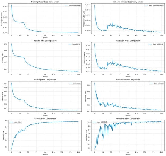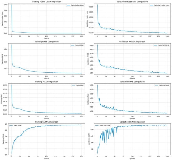 To assess the accuracy and reliability of the deep learning models in both training and evaluation phases, various quantitative metrics were employed, tailored to the regression nature of the floodwater depth prediction. These metrics were selected to capture both pixel-level numerical errors and structural agreement between predicted and reference flood depth maps. The indicators include regression-based error measures, such as Mean Absolute Error (MAE), Root Mean Squared Error (RMSE), and Huber Loss, which quantify the magnitude and distribution of prediction errors, as well as perceptual and statistical similarity metrics like the Structural Similarity Index (SSIM) and the coefficient of determination (R-Squared). Each metric provides a complementary perspective, enabling a comprehensive evaluation of both the precision and the structural fidelity of the model outputs (Table 3).