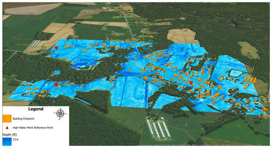 Post-flood aerial imagery, used to capture surface conditions shortly after the hurricanes, was obtained from the NOAA Storms Archive. For the study areas, imagery corresponding to Hurricane Matthew was acquired between 10 and 15 October 2016, and for Hurricane Florence, on 18 September 2018. They have a spatial resolution of approximately 0.25 m and cover only the affected settlement areas included in this study. Digital Terrain Models, derived from LiDAR point clouds, were sourced from the North Carolina Emergency Management Spatial Data Portal and the USGS 3D Elevation Program (3DEP), with a spatial resolution of approximately 1 m. Finally, High water Mark (HWM) data, collected by the Federal Emergency Management Agency (FEMA) in partnership with USGS after storm events, were used to provide reference floodwater depth measurements for evaluation. These datasets provided essential inputs for estimating floodwater depth with high spatial precision.