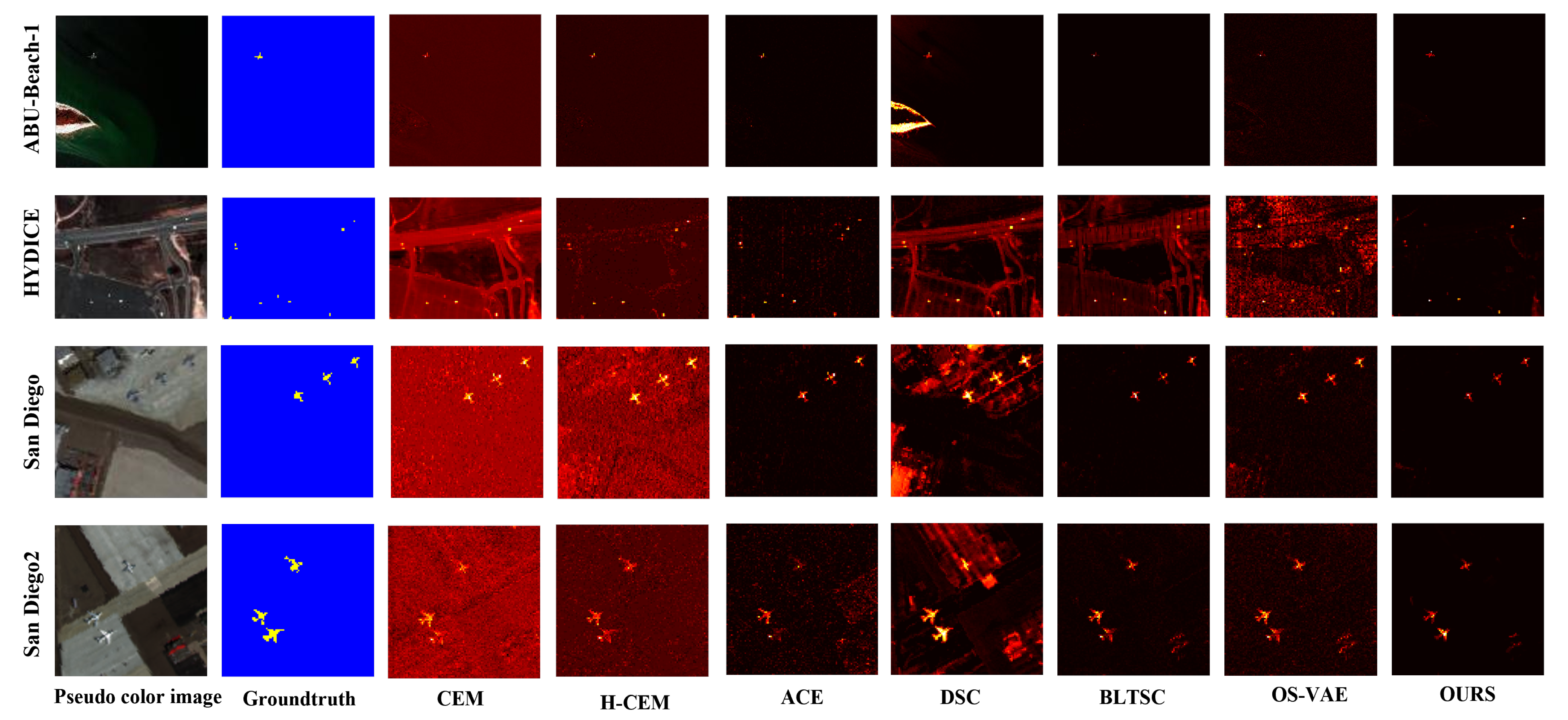 29], which employs an improved autoencoder to extract target features and then uses a linear prediction strategy to distinguish background spectra from target samples. However, they are inherently constrained by the scarcity of high-quality labeled samples, as acquiring sufficient pixel-level annotations is costly and time-consuming, particularly when targets are small or rare. Unsupervised models, in contrast, aim to enhance the network’s ability to learn latent target representations by applying specific constraints, thereby alleviating the difficulty of collecting large-scale labeled hyperspectral datasets [