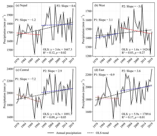 Interannual variation of precipitation in Nepal from 1979 to 2020 based on TPHiPr. (a) for the whole Nepal, and (b–d) for the western, central, and eastern regions, respectively. The year 1996 is marked as a change point as shown by a vertical dashed line. y represents the trend of the entire study period (black dotted line), and Slope (mm yr−1) represents the ordinary least squares (OLS) trend of precipitation during the period before and after 1996 (P1: 1979–1996; P2: 1997–2020), respectively. The red and blue dotted lines indicate that precipitation has a decreasing and increasing trend at different stages, respectively. The regression equation is for the entire study period.