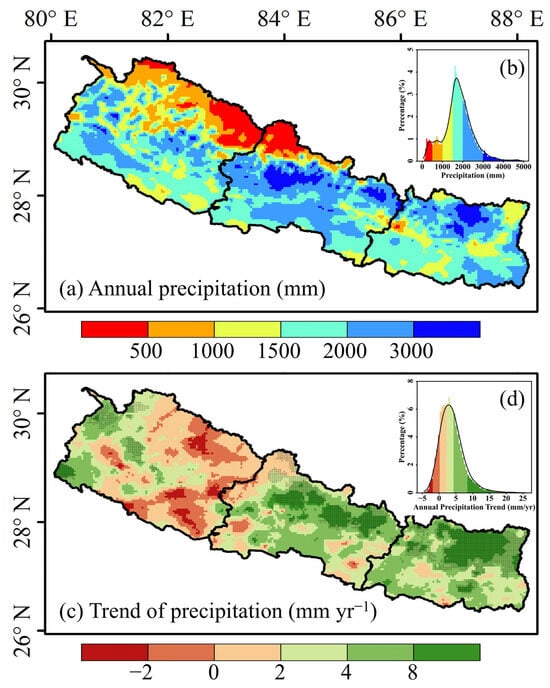 Spatial pattern of annual precipitation in Nepal (1979–2020). (a) spatial distribution, (b) precipitation frequency distribution, (c) interannual trend of annual precipitation, and (d) interannual precipitation trend frequency distribution. The black lines in (b,d) are Gaussian smooth curves explain the annual precipitation and its trend in different ranges as a percentage of the area of Nepal. The cross areas in (c) indicate significant trend in annual precipitation (p < 0.05).