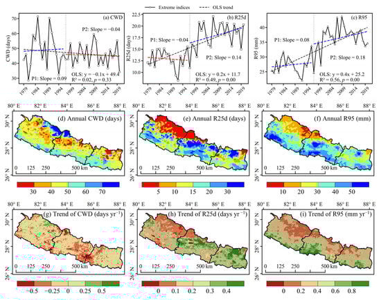 Interannual variations and spatial patterns of extreme precipitation in Nepal (1979–2020). (a–c) interannual variations, (d–f) spatial distribution of multi-year mean, (g–i) spatial distribution of interannual variability. The cross areas in (g–i) indicate significant trend (p < 0.05). CWD is the maximum consecutive wet days, R25d is the number of days with daily rainfall ≥ 25 mm, and R95 is the 95th percentile of precipitation. The year 1996 is marked as a change point as shown by a vertical dashed line. y represents the trend of the entire study period (black dotted line), and Slope (mm yr−1) represent the ordinary least squares (OLS) trend of precipitation during the period before and after 1996 (P1: 1979–1996; P2: 1997–2020), respectively. The red and blue dotted lines indicate that precipitation has a decreasing and increasing trend at different stages, respectively. The regression equation is for the entire study period.