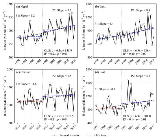 Interannual variation of the annual R-factor across Nepal from 1979 to 2020: (a) Whole Nepal, (b) Western Nepal, (c) Central Nepal, (d) Eastern Nepal. The year 1996 is marked as a change point as shown by a vertical dashed line. y represents the trend of the entire study period (black dotted line), and Slope (mm yr−1) represent the ordinary least squares (OLS) trend of precipitation during the period before and after 1996 (P1: 1979–1996; P2: 1997–2020), respectively. The red and blue dotted lines indicate that precipitation has a decreasing and increasing trend at different stages, respectively. The regression equation is for the entire study period.