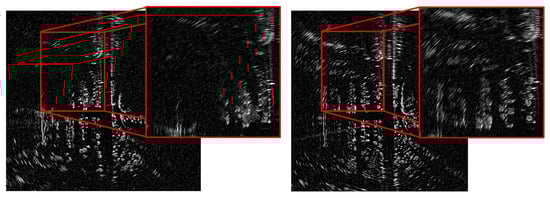 The difference between two adjacent raw radar data. The red boxes highlight areas with significant feature differences between frames.