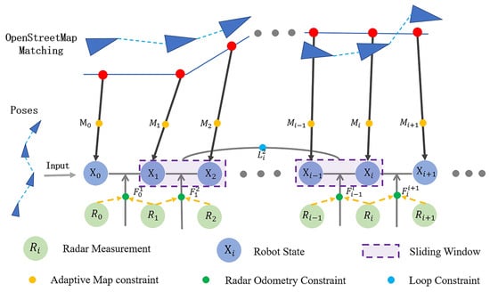 Loop constraints are limited by the number of revisited areas along the trajectory, making it challenging to continuously correct accumulated errors caused by fluctuated radar features. Road network from OpenStreetMap, being easily accessible and structurally simple, can readily provide coarse but global pose references for the system. Consequently, we propose an adaptive map constraint approach (see Figure 5). By regarding the state estimation problem as a maximum a posteriori (MAP) problem, we define three types of factors to optimize the state X: odometry factors, loop factors, and adaptive map factors, as illustrated in (14).