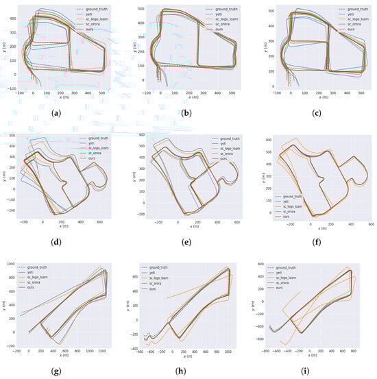 The bridge scenarios present a challenge due to their overall lack of distinctive features and repetitive features. LiDAR algorithms performed inconsistently in these scenarios, whereas millimeter-wave radar algorithms, despite potential end-point error increase, generally ensured better trajectory consistency. This could be due to the longer detection range and higher penetration of millimeter-wave radar, which allows it to capture a greater number of geometric structural features that are occluded by roadside trees. We observed a notable increase in error levels for our algorithm in the Riverside03 sequence. The trajectory plot reveals a deviation in the final orientation, which may be attributed to differences in vehicle movement trajectories and the geometric layout of the Riverside03 map compared to the other sequences. These differences likely caused deviations in the constraints. Similarly, LSRL experiences problems in Riverside03, which are attributed to outdated map data [59]. Despite these challenges, our observations indicate that, although the algorithm’s performance is influenced by map accuracy, it still maintains overall geometric consistency, demonstrating its fault tolerance.