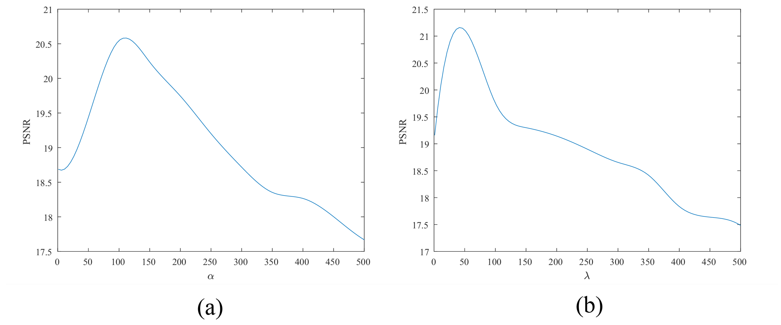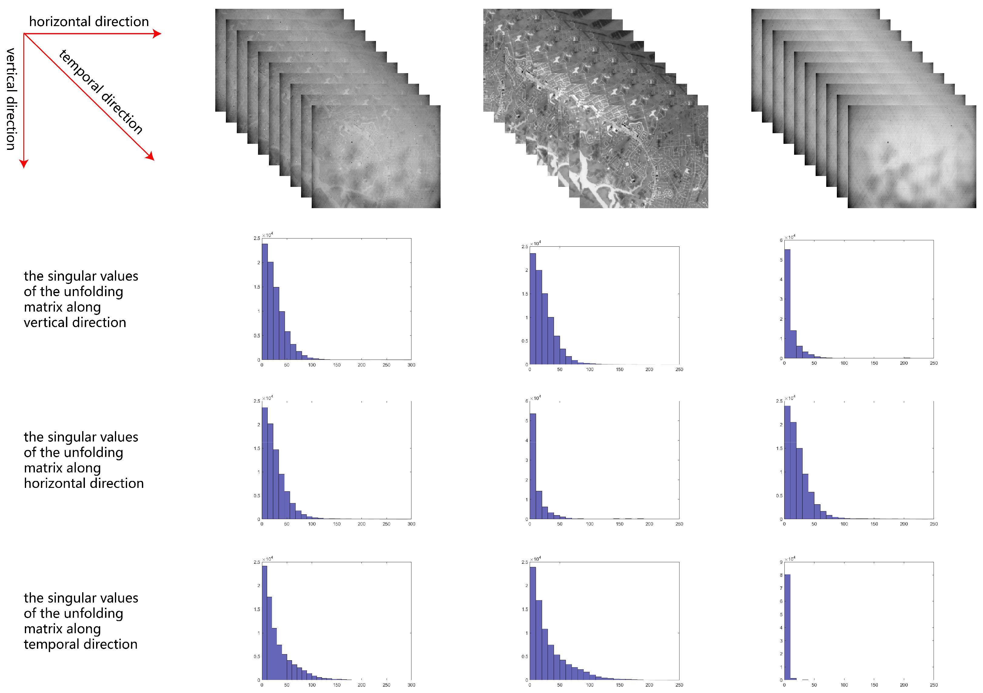 - Smoothness of nonuniform noisy image in the time direction: Because nonuniform noise is additive, the derivative of the noisy image is sparse in the time direction in Figure 4, whereas the derivative of the desired noise-free image is not sparse. Therefore, the paradigm of is used to enhance the Smoothness of the noisy image in the time direction.