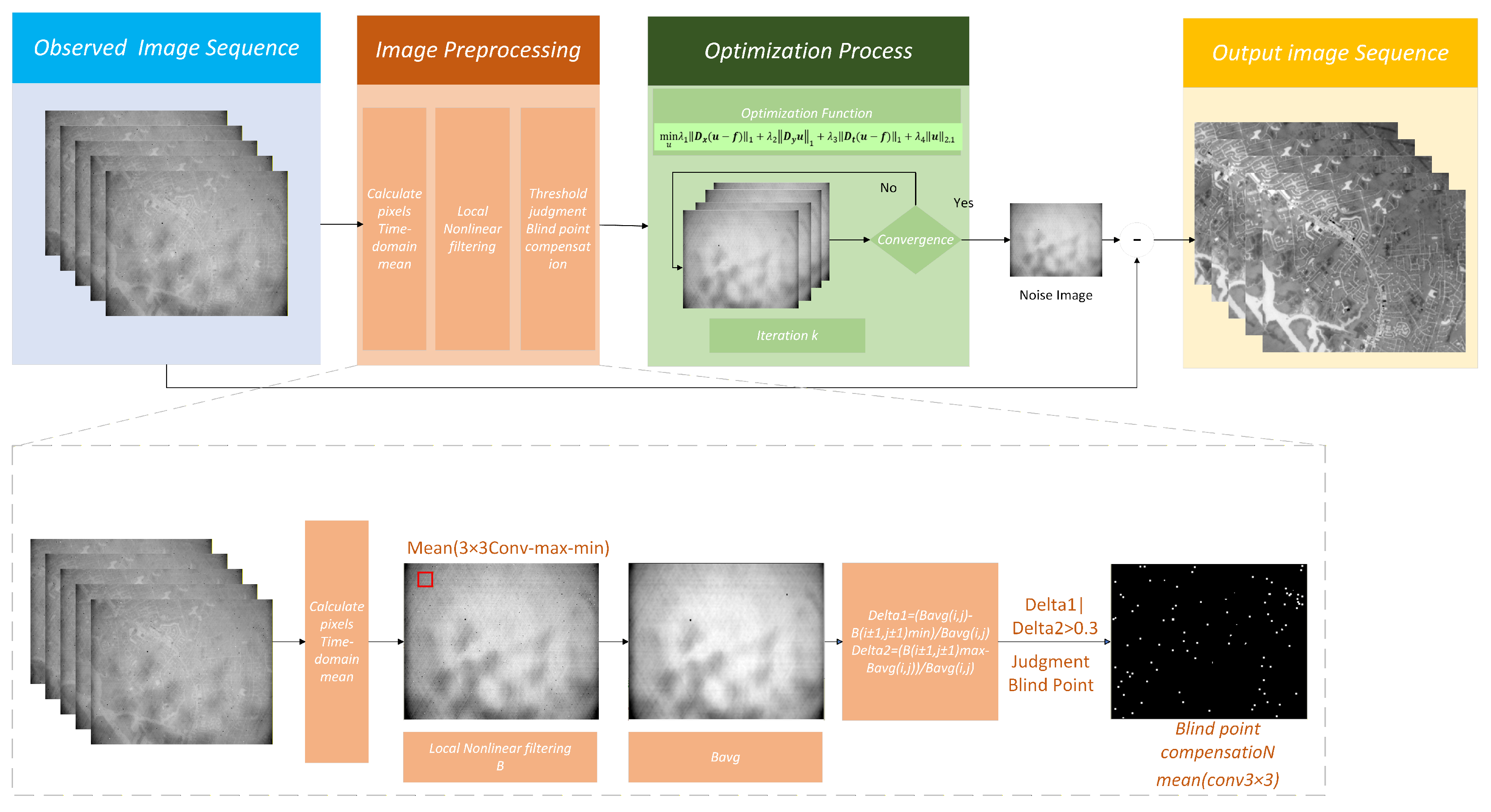 - For the sparsity of noisy images in the time domain, the innovative inclusion of a time-domain difference operator in the denoising model helps to separate the noisy images from the observed ones, and the a priori constraints on the infrared images using regularization can effectively remove the noise so as to better preserve the detailed information and reduce the ghosting artifacts.