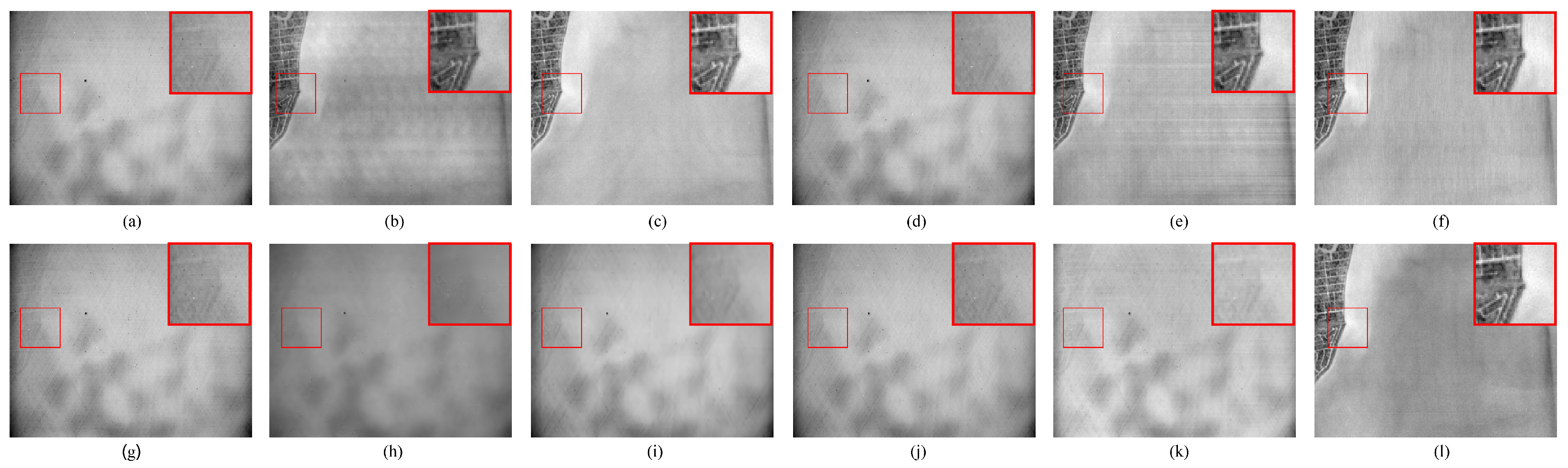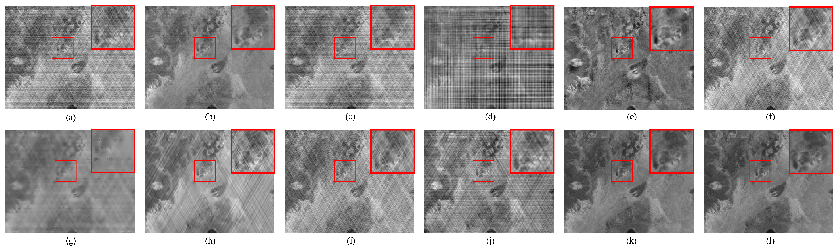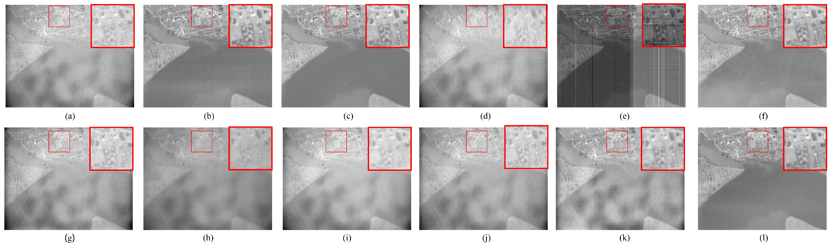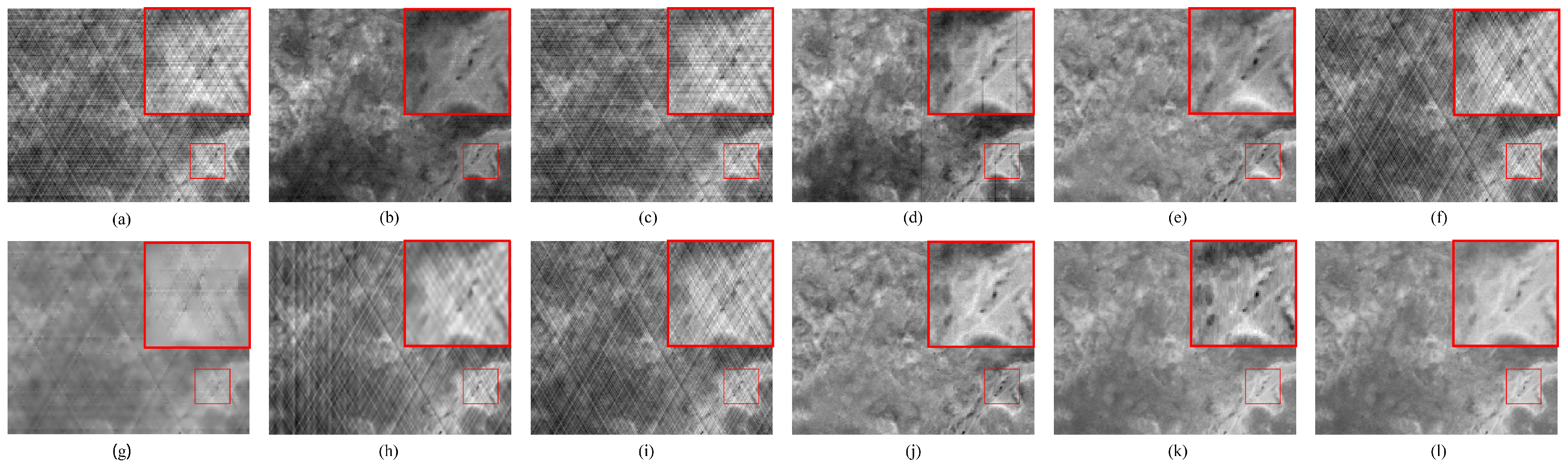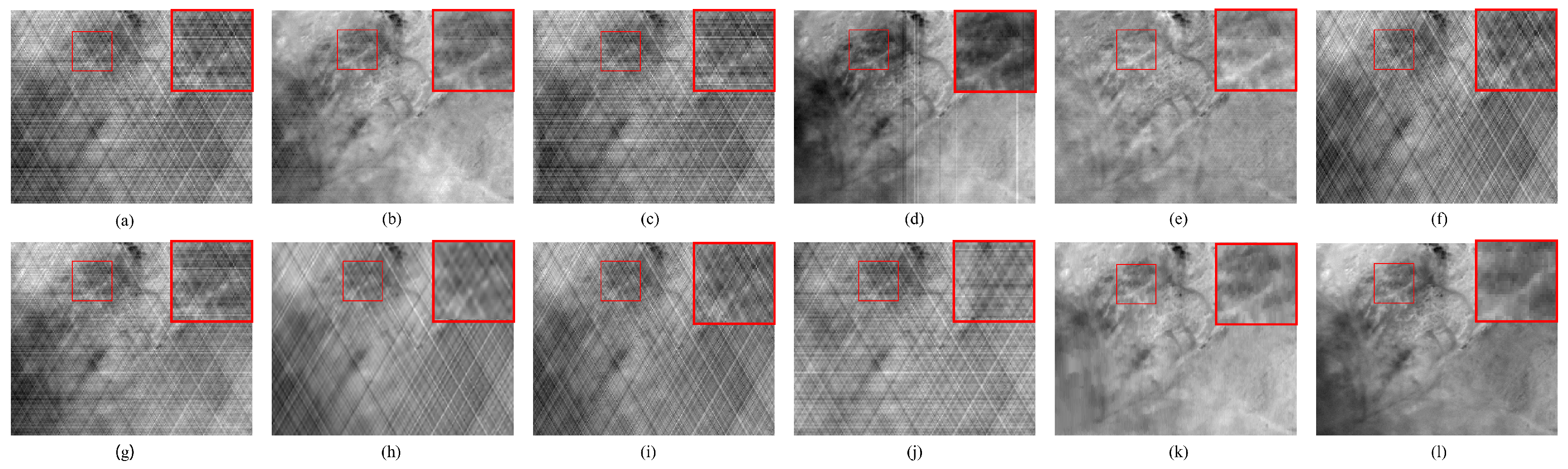- Song, L.; Huang, H. Simultaneous destriping and image denoising using a nonparametric model with the EM algorithm. IEEE Trans. Image Process. 2023, 32, 1065–1077. [Google Scholar] [CrossRef]