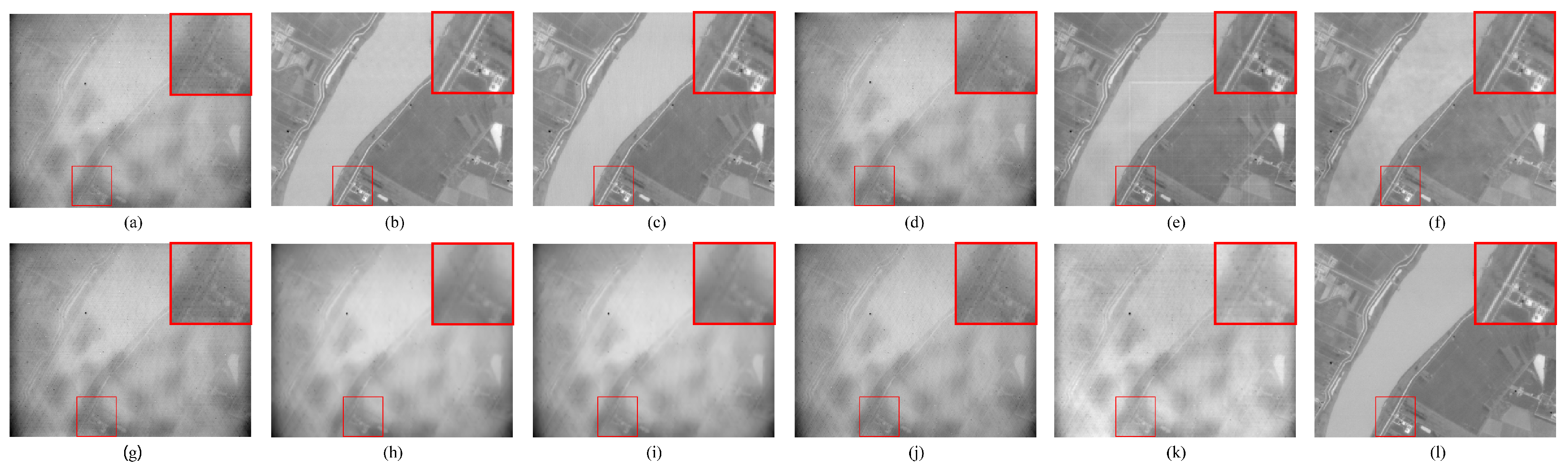 - Zhang, J.; Zhou, X.; Li, L.; Hu, T.; Fansheng, C. A combined stripe noise removal and deblurring recovering method for thermal infrared remote sensing images. IEEE Trans. Geosci. Remote Sens. 2022, 60, 5003214. [Google Scholar] [CrossRef]