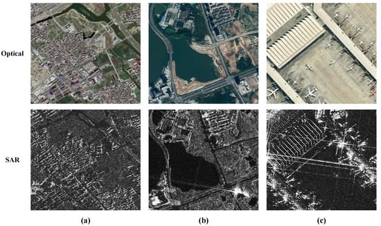 Example of Optical and SAR Image Pairs. The images in (a,b) are obtained from the FUSAR-Map dataset [14]. The SAR image in (c) is obtained from the FAIR-CSAR dataset [15], and the corresponding optical image in (c) is sourced from Google Maps.