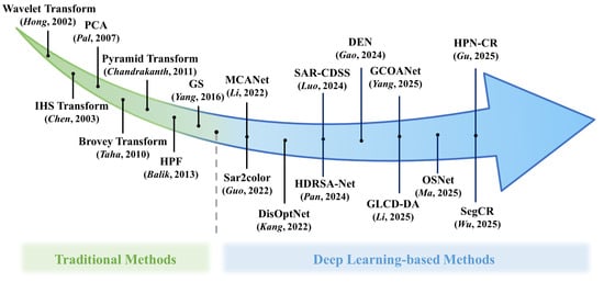 The milestones in the development of OPT-SAR fusion technology. (PCA [34], GS [35], IHS Transform [36], Brovey Transform [37], HPF [38], Pyramid Transform [39], Wavelet Transform [40], HPN-CR [41], DEN [42], OSNet [43], Sar2color [44], SegCR [45], SAR-CDSS [46], GLCD-DA [47], GCOANet [48], MCANet [49], HDRSA-Net [50], DisOptNet [51]).