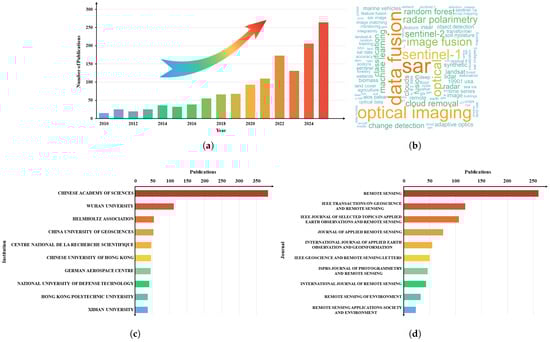 To systematically review the research progress in the field of OPT-SAR fusion, this paper conducts a literature search based on the Web of Science database. The search strategy was “(Optical OR “Optical imagery” OR “Optical image”) AND (SAR OR “Synthetic Aperture Radar”) AND (Fusion OR Integration OR “Joint interpretation”)”, the document type was “Academic Journal Article”, and the time range was limited to 2010 to 2025 (up to October 2025). After format standardization and deduplication, a total of 1361 valid documents were obtained. Detailed information about the search results is shown in Figure 3. As shown in Figure 3a, the sharp increase in the number of publications highlights the growing importance of and expanding research interest in this field.