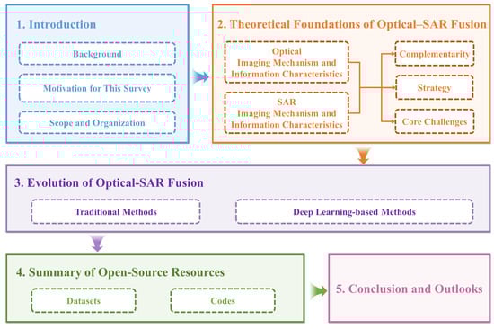 The remainder of this article is organized as follows, and the overall framework is illustrated in Figure 4. Section 2 outlines the theoretical foundation of OPT-SAR fusion, analyzes their complementarity from the perspectives of imaging mechanisms and information characteristics, and summarizes typical fusion strategies and core challenges. In Section 3, the history of OPT-SAR fusion methods is reviewed. Section 4 provides a comprehensive review of open-source resources in the field of OPT-SAR fusion from the perspective of downstream applications. Finally, Section 5 summarizes the entire paper and explores possible future research directions.