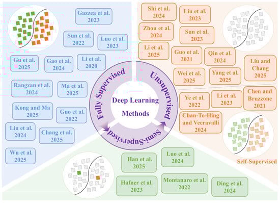 The deep learning-based methods of OPT-SAR fusion, including fully supervised [23,41,42,43,44,45,94,95,96,97,98,99,100], semi-supervised [46,77,101,102,103], unsupervised [22,47,48,78,104,105,106,107,108,109], and self-supervised learning [110,111,112,113].)