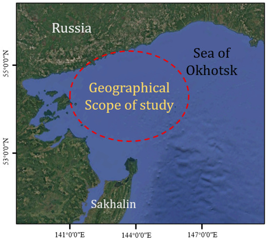 In current remote sensing technology, passive microwave radiometers, optical sensors and SAR serve as the primary means for acquiring terrestrial information. Nevertheless, the relatively low spatial resolution of passive microwave radiometers somewhat limits their capability to observe detailed surface features. Consequently, we explore the fusion of SAR and optical data to enhance dataset quality and usability. A temporal correlation-based matching algorithm for remote sensing images is developed. This algorithm automatically identifies image pairs with acquisition time intervals within 24 h from globally collected optical and SAR satellite imagery. Subsequently, manual visual inspection is applied to exclude pairs exhibiting excessive geolocation discrepancies in the target areas. Following this procedure, the Sea of Okhotsk in late winter and early spring is selected as the primary study area, with data sourced from the GaoFen-3 satellite and the Landsat series. The study area is presented in Figure 1.