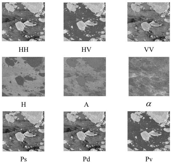 Fully polarimetric SAR data contain rich polarimetric information, for which we perform polarimetric feature extraction. The scattering matrix S is constructed from HH, HV, VH, and VV polarizations, as shown in Equation (1). Due to the reciprocity theorem, the scattering matrix satisfies , and thus only HH, HV, and VV polarizations are utilized here. Subsequently, we calculate the polarization ratios and coherence parameter (PRCD) and the polarimetric decomposition parameter (PDP) from the fully polarimetric SAR data.