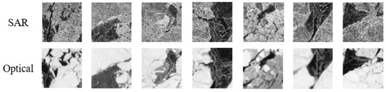 The dataset construction workflow is illustrated in Figure 3. For the SAR data processing, preprocessing steps are sequentially performed, including geometric correction, noise reduction, polarimetric information extraction, and histogram equalization. For the optical data, the procedures involve geometric calibration, atmospheric correction, noise reduction and pixel value normalization. In the denoising step, a modified 3 × 3 Lee filter [20] is uniformly applied across both data types. This filter effectively suppresses noise and preserves image detail. Following preprocessing, the SAR data comprises 16 channels, including the amplitude components of the HH, HV, and VV polarizations along with 13 derived polarimetric features. The optical data consist of the three visible bands: red, green, and blue.