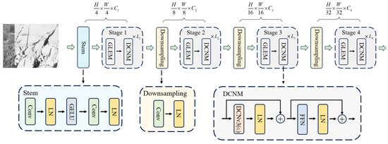 The proposed backbone network, GLDCN, is illustrated in Figure 7. This network adopts a four-stage progressive architecture, where each stage primarily consists of a lightweight Global-Local Extraction Module (GLEM) and a Deformable Convolutional Network Module (DCNM). By introducing a complementary mechanism for global and local features and leveraging dynamic convolution to facilitate information interaction across different sea ice sampling points, GLDCN effectively models long-range spatial dependencies within sea ice imagery. This design helps mitigate the limitations of traditional CNNs in capturing discriminative features such as sea ice edges and textures.