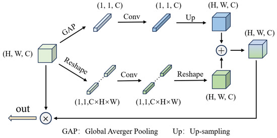 As illustrated in Figure 8, the GLEM captures global distributions and local details through a dual-branch structure. In the Global Enhancement (GE) branch, global average pooling (GAP) is applied to the input features, producing channel-wise statistics that characterize large-scale sea ice information. The Local Enhancement (LE) branch reshapes the input tensor into a 1 × 1 × (C × H × W) representation and utilizes 1 × 1 convolution to capture pixel-level contextual relationships while preserving spatial resolution. Following feature extraction in each branch, the resulting representations are restored to their original spatial dimensions via Up-sampling and combined through element-wise summation. This integration yields hybrid attention weights that effectively balance global consistency with local discriminability. Finally, these weights are applied to the original features, achieving lightweight enhancement with channel-spatial coupling.