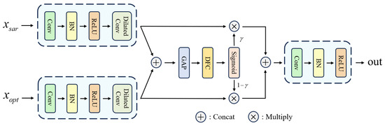 The module first performs preprocessing on the features extracted from the backbone network. Specifically, the SAR features and optical features output by the backbone are processed separately by two independent structural branches. Each branch sequentially consists of a 3 × 3 convolutional layer, a Batch Normalization (BN) layer, a ReLU activation function, and a dilated convolutional layer. The dilated convolutional layer (dilation rate = 3) serves to expand the receptive field, thereby capturing more representative contextual information. This design employs separate branches for feature extraction from SAR and optical data prior to fusion, which mitigates potential information loss caused by data heterogeneity. This preprocessing pipeline establishes a robust foundation for subsequent deep fusion, effectively bridging the potential semantic gap arising from different data modalities.