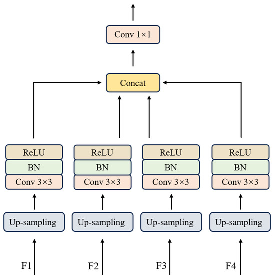The decoder component, inspired by the cascade strategy of UPerHead [27], proposes a cooperative upsampling fusion mechanism designed to fully exploit and restore multi-scale fused features, as illustrated in Figure 10. For details, starting from the multi-level features F1, F2, F3, and F4 output by the fusion layer, the decoder progressively performs semantic enhancement and spatial resolution alignment. First, the features from all four levels are upsampled via bilinear interpolation to restore the spatial resolution of the initial input. Subsequently, a 3 × 3 convolution layer, BN layer, and ReLU activation are independently applied to each feature layer to refine local details and transform channel-wise semantics. Then, four feature layers are concatenated along the channel dimension to construct a fused representation. Finally, a 1 × 1 convolution is employed for channel compression and pixel-wise segmentation prediction, producing segmentation results that effectively preserve fine-grained structures. By aggregating semantic information from various network levels, the proposed decoder achieves deep utilization of features, significantly enhancing the model’s ability to interpret complex sea ice conditions.