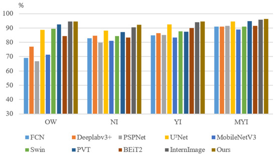 Figure 11 intuitively illustrates the comparison of classification accuracy across different methods. It can be observed that for the MYI category, which contains a sufficient number of samples, most methods achieve relatively high accuracy. However, for the OW category, where the number of samples is limited, only the PVT, InternImage, and GLDCN methods exhibit a clear distinction. The results shown in the figure collectively indicate that the proposed GLDCN method achieves high accuracy across all categories, demonstrating its strong generalization capability when dealing with class-imbalanced data.