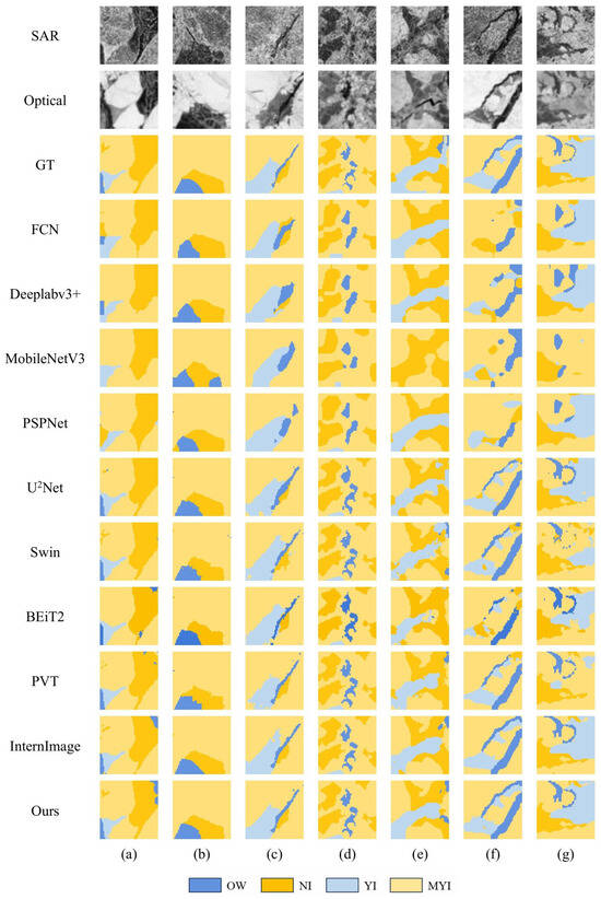 Comparison of segmentation results on different data. (a–g) are seven ice chart samples randomly selected.