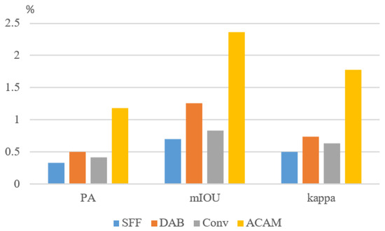 To evaluate the effectiveness of the proposed ACAM fusion module in integrating SAR and optical image information, comparative experiments are conducted based on the GLDCN backbone using several mainstream fusion strategies, including SFF [35], DAB [36], and a conventional convolution-based fusion module. As shown in Table 3, ACAM achieves the highest performance, with PA, mIoU, and Kappa coefficient values of 95.99%, 91.3%, and 93.99%, respectively. These results demonstrate the superior overall classification capability of the proposed approach. Figure 13 shows each module over the baseline in PA, mIoU, and the Kappa coefficient, providing a more intuitive illustration of this point.