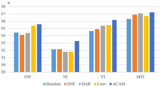 In particular, ACAM surpasses the second-best module by 1.10% in mIoU and 1.04% in the Kappa coefficient, confirming its effectiveness in capturing inter-class distinctions and mitigating class imbalance issues. Figure 14 further illustrates this advantage from a category-wise perspective: ACAM consistently maintains the highest classification accuracy in all four categories of sea ice, with the most pronounced improvement observed for NI. This improvement can be attributed to ACAM’s enhanced ability to fuse fine-grained local details with broader contextual information, thereby enabling more accurate perception and discrimination of morphologically diverse NI types.