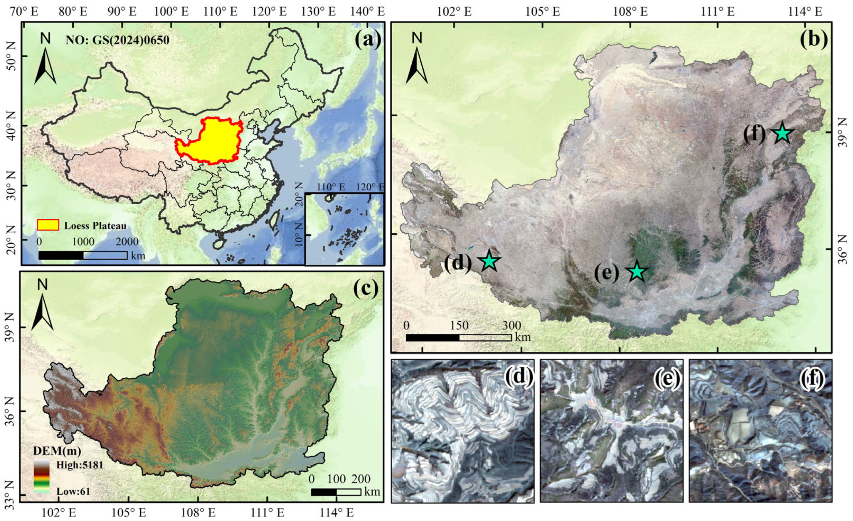 - Lu, Y.; Li, X.; Xin, L.; Song, H.; Wang, X. Mapping the terraces on the Loess Plateau based on a deep learning-based model at 1.89 m resolution. Sci. Data 2023, 10, 115. [Google Scholar] [CrossRef] [PubMed]