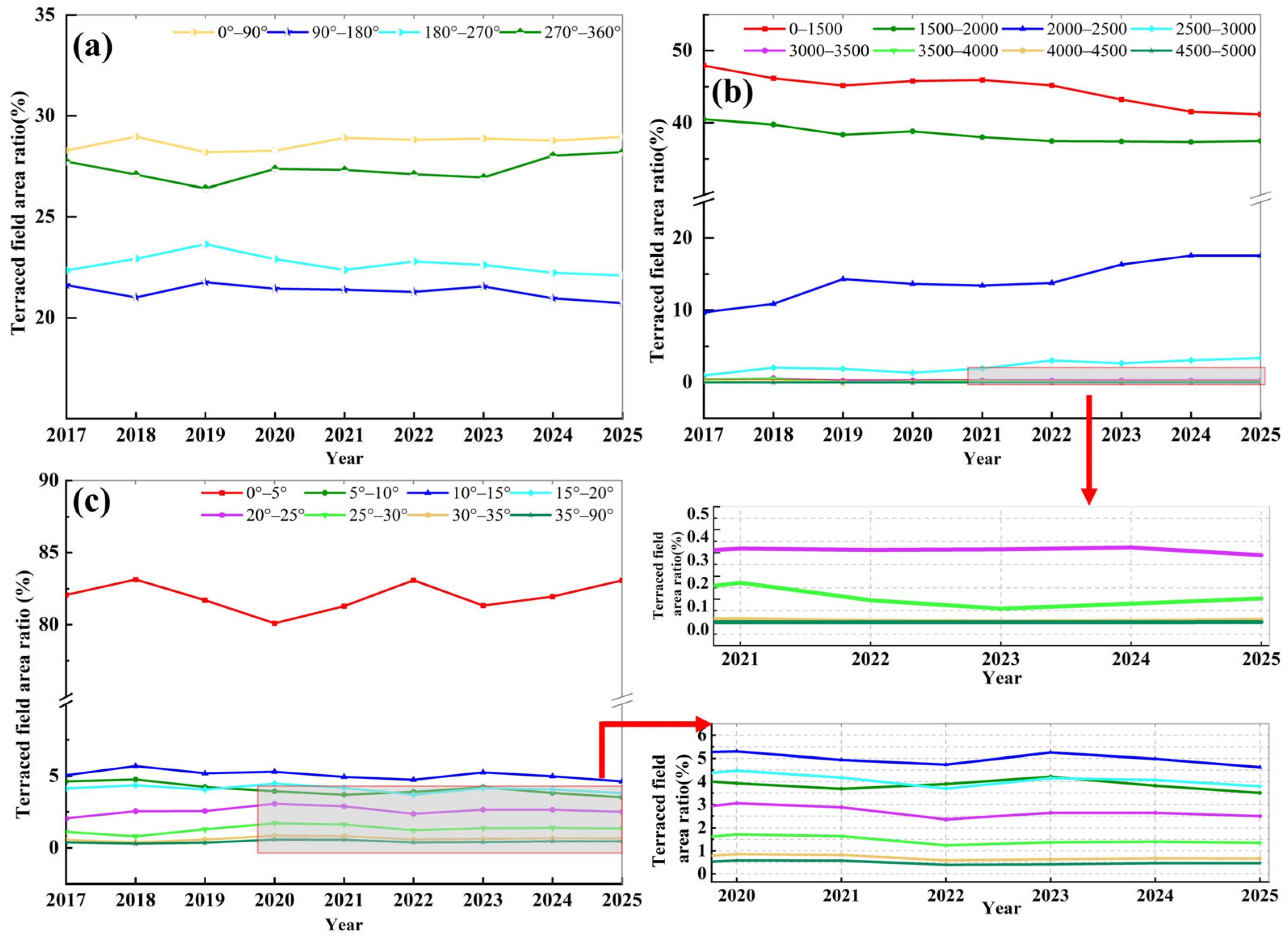 - We constructed an annual spatiotemporal dataset of terraced fields on the Loess Plateau, covering nine time periods from 2017 to 2025, which enables a systematic analysis of their spatiotemporal variation characteristics. The terraces are predominantly distributed in low-altitude areas with gentle slopes, exhibiting a significant spatial coupling relationship with terrain gradient.