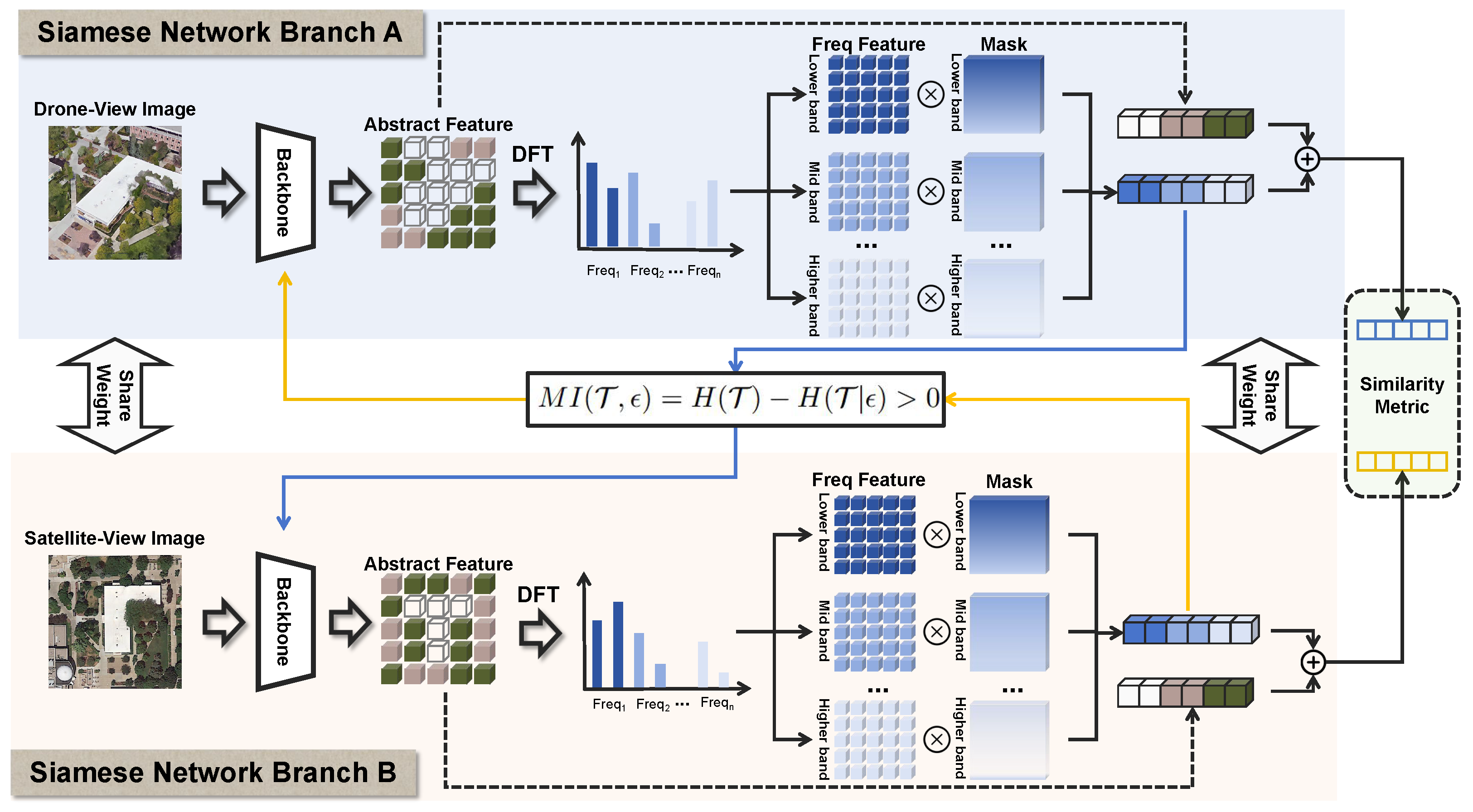 This adaptive fusion mechanism enables the network to selectively enhance frequency components that provide positive excitation and are most beneficial for discriminative learning, while noisy or redundant signals are effectively suppressed. In distinction from conventional frequency-domain approaches that treat frequency bands as discrete matching units, the proposed Frequency-Based Positive-Incentive Information Screening mechanism is grounded in -Noise theory and prioritizes the screening of task-relevant frequency components via entropy maximization. This approach ensures that the retained frequency bands not only exhibit high mutual information with the target task but also align with the optimization logic of siamese networks. This optimization logic centers on enhancing view-invariant features and suppressing domain discrepancies between multi-view images, thereby reinforcing feature alignment across heterogeneous perspectives, including drone-view and satellite imagery.