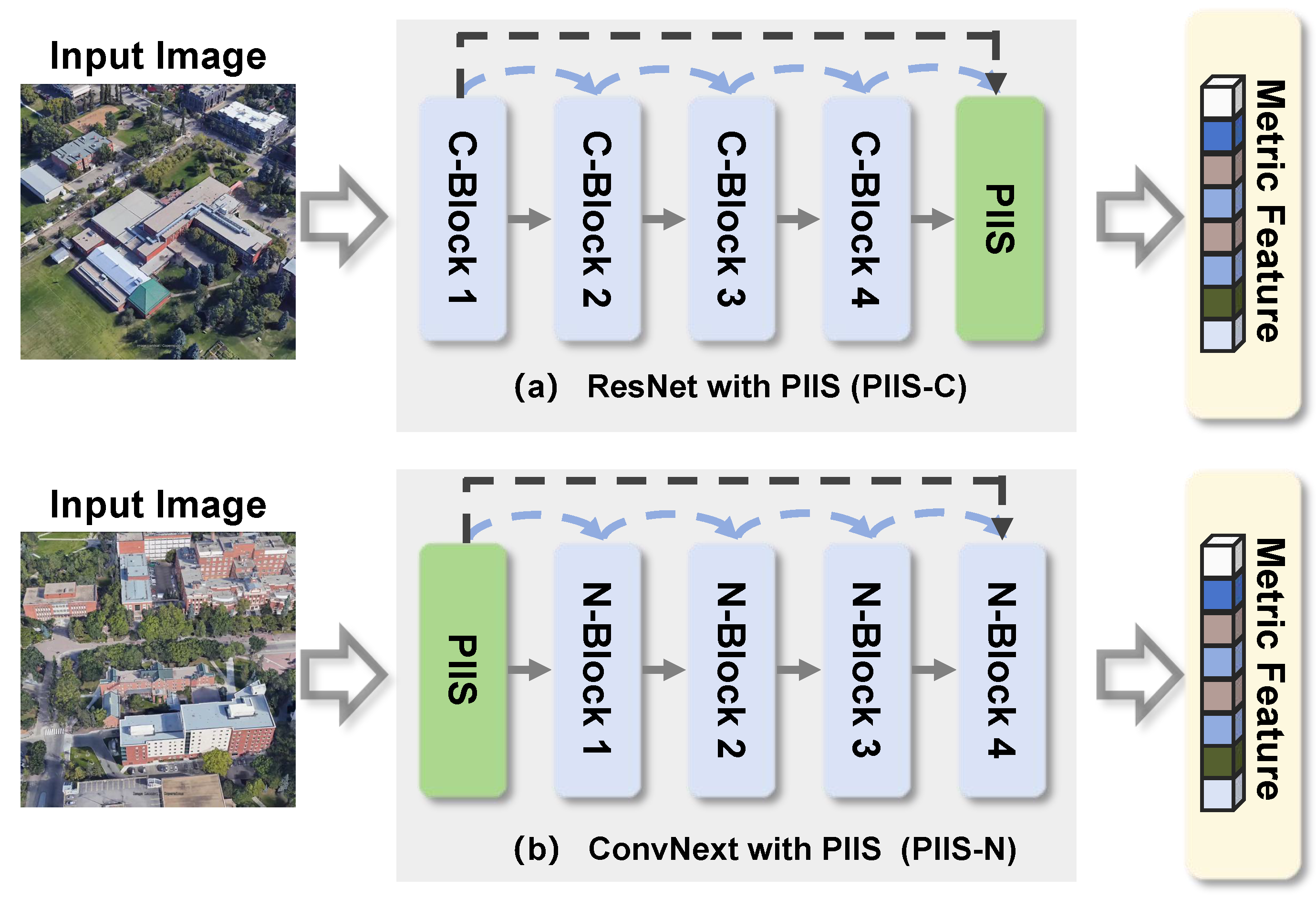 For multi-view geo-localization tasks utilizing CNN backbone networks, the PIIS-C model is innovatively constructed, as illustrated in