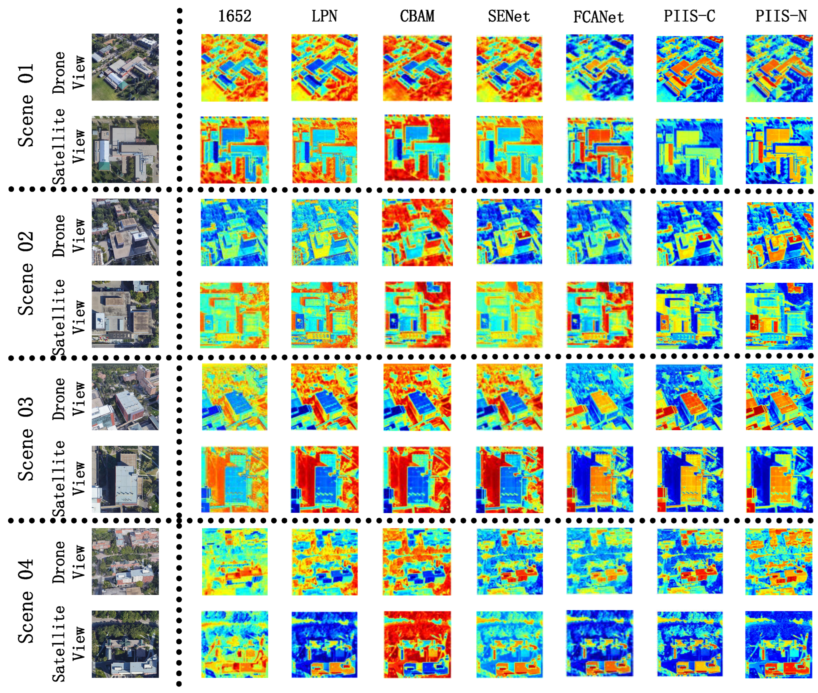 When the localization range is extended to 300 m, PIIS-N maintains competitive performance, providing further validation for the scale-invariant properties inherent in frequency-domain representations. Particularly compelling is the outstanding achievement of the framework at intermediate ranges of 200 and 250 m, where it surpasses all benchmark methods. This result substantiates that the architecture achieves optimal multi-scale feature integration through adaptive frequency selection. This finding aligns with frequency-domain decomposition theory, which posits that geo-localization tasks across varying distances rely on distinct characteristic scales; the frequency selection mechanism in PIIS-N successfully maintains a dynamic equilibrium among these hierarchical features.