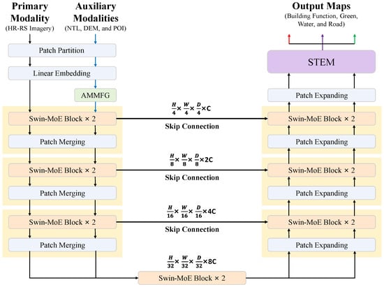Overview of the proposed BuildFunc-MoE architecture. HR-RS imagery is used as the primary modality, while NTL, DEM, and POI serve as auxiliary inputs. Features are fused by the AMMFG and encoded by a hierarchical Swin-MoE backbone with skip connections. The STEM decodes multi-scale features to produce building-function maps and ancillary outputs for green, water, and road layers.
