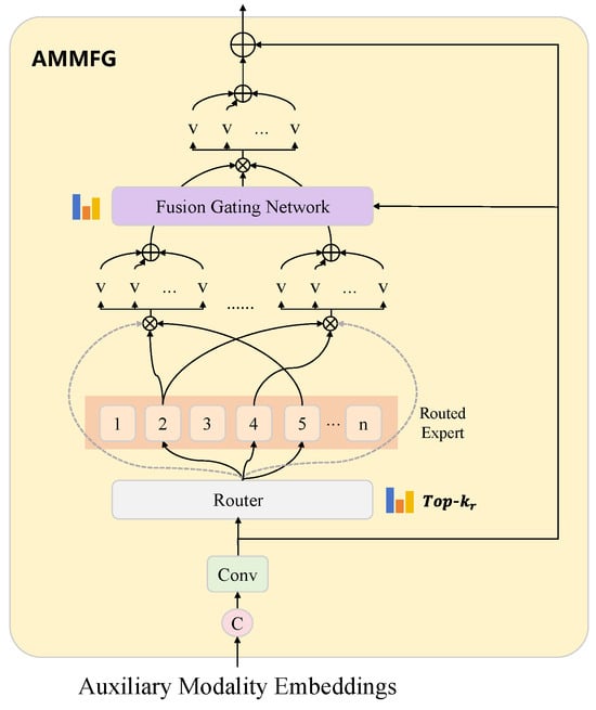 Detailed structure of the AMMFG. The Adaptive Multimodal Fusion Gate (AMMFG) adaptively fuses auxiliary modality features using a Mixture-of-Experts structure and top-k gating, enabling efficient and flexible integration of diverse data sources.