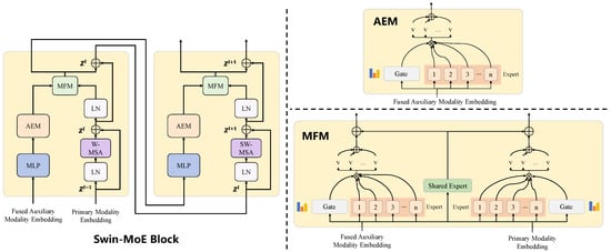 Detailed structure of the Swin-MoE block. The Swin-MoE block uses Mixture-of-Experts modules and dynamic gating to adaptively fuse auxiliary and primary modality features, enabling efficient cross-modal information exchange.