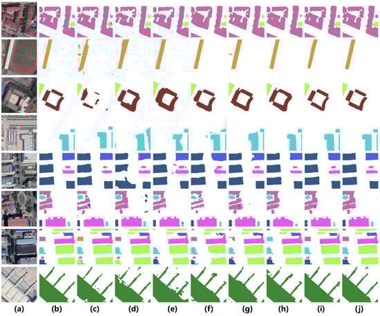 Qualitative comparison of building function segmentation on representative scenes from the Wuhan-BF dataset. (a) HR-RS imagery; (b) ground truth; (c) CTCFNet; (d) CSAGFNet; (e) UnifiedDL-UFZ; (f) MMBT; (g) MAFNet; (h) AWIFMNet; (i) BuildFunc-MoE (Ours); (j) BuildFunc-MoE * (Ours). The building function types follow the color legend defined in Figure 5. All models were trained and evaluated under the same supervised setting. The PyTorch implementation of BuildFunc-MoE was employed for comparison with other baselines, whereas the LuoJiaNET implementation (denoted by “*” ) exhibited higher accuracy due to optimized computation.