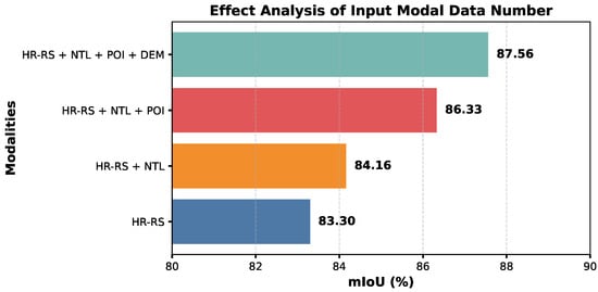 To investigate the influence of input modality composition on the proposed BuildFunc-MoE model, we conducted a controlled experiment by incrementally increasing the number of input data modalities. As shown in Figure 8, the overall segmentation performance consistently improves as more modalities are incorporated, confirming the model’s capacity to effectively integrate heterogeneous geospatial information. Using only HR-RS imagery yields an mIoU of 83.30%, which serves as the unimodal baseline. Adding NTL data increases the mIoU to 84.16%, demonstrating that the additional spatial–contextual signal contributes to better representation of built-up intensity. When POI data are further introduced, the mIoU rises to 86.33%, indicating that semantic and functional context enrich the model’s feature space. Finally, incorporating DEM information leads to the highest mIoU of 87.56%, showing that terrain and elevation cues provide complementary topographic information that further enhances segmentation accuracy.