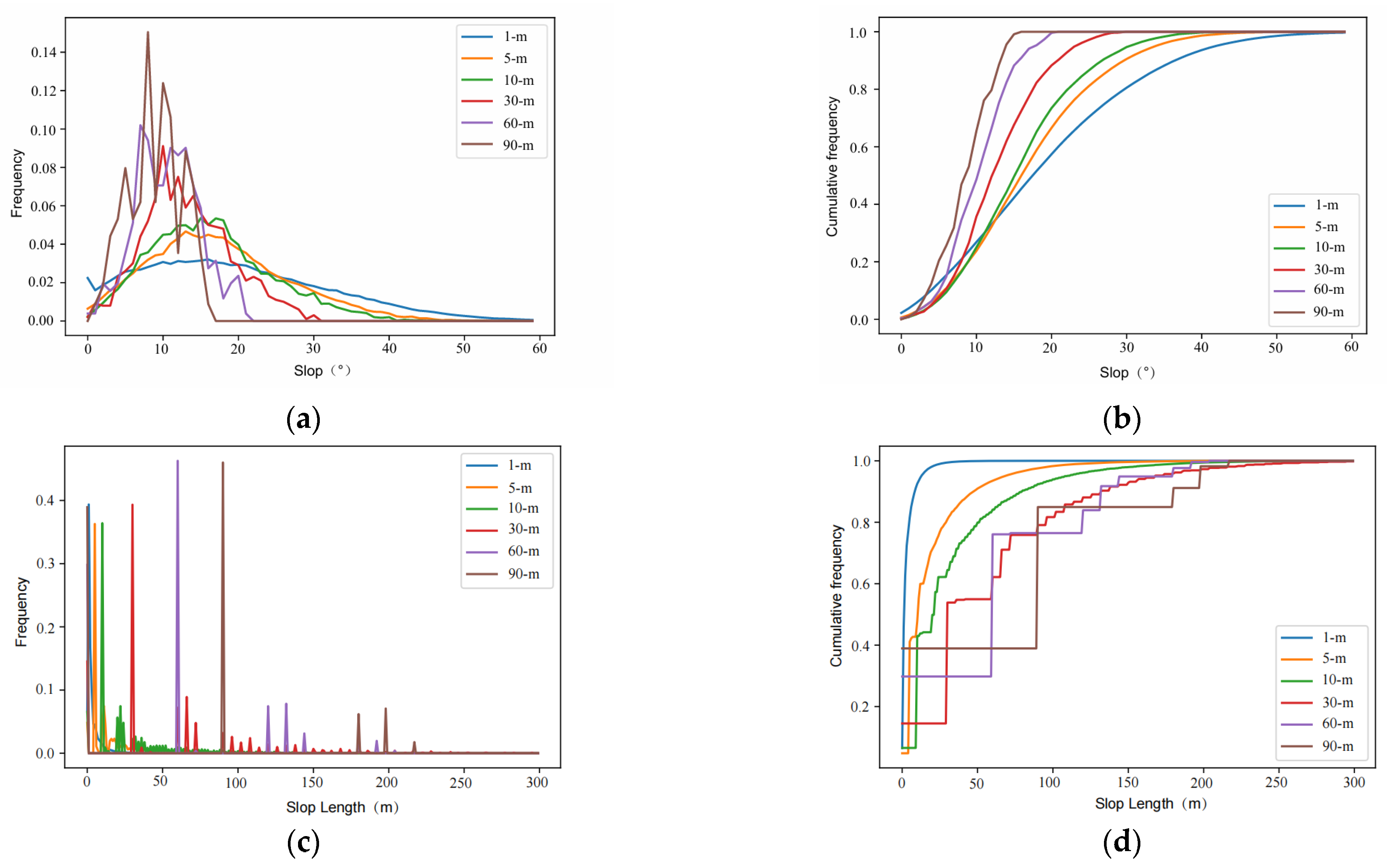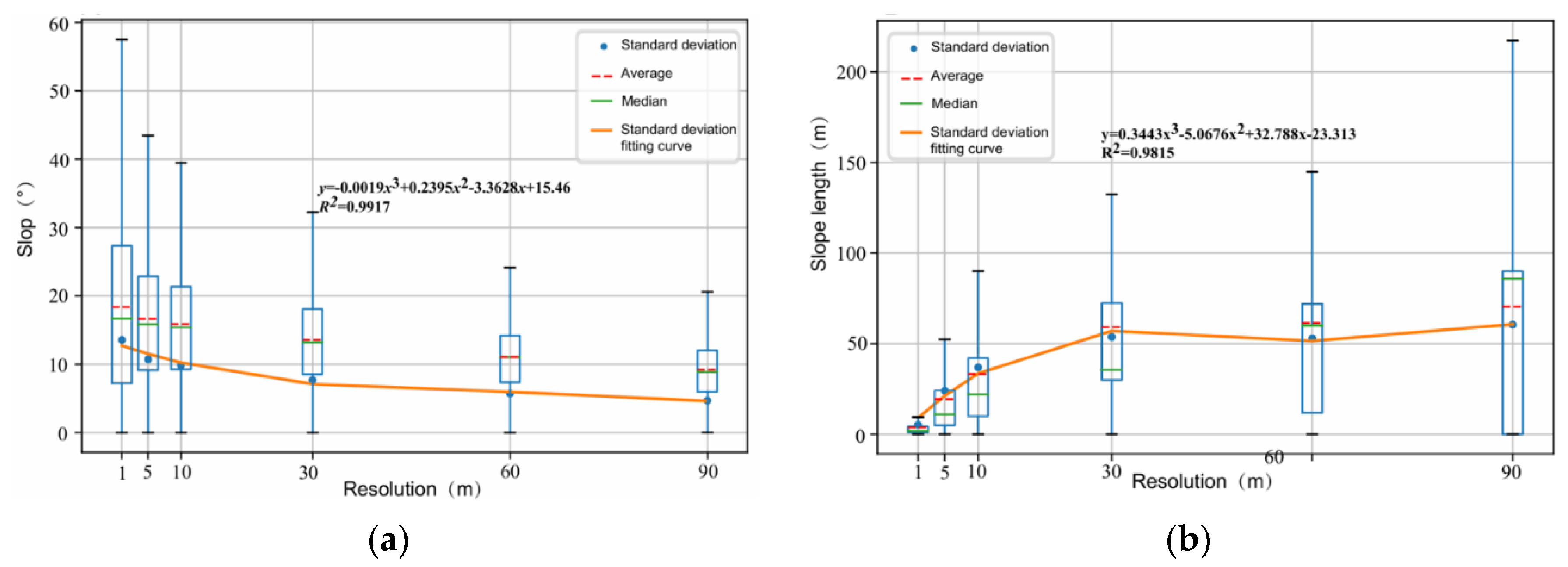 - Wang, C.; Shan, L.; Liu, X.; Yang, Q.; Cruse, R.M.; Liu, B.; Li, R.; Zhang, H.; Pang, G. Impacts of Horizontal Resolution and Downscaling on the USLE LS Factor for Different Terrains. Int. Soil Water Conserv. Res. 2020, 8, 363–372. [Google Scholar] [CrossRef]