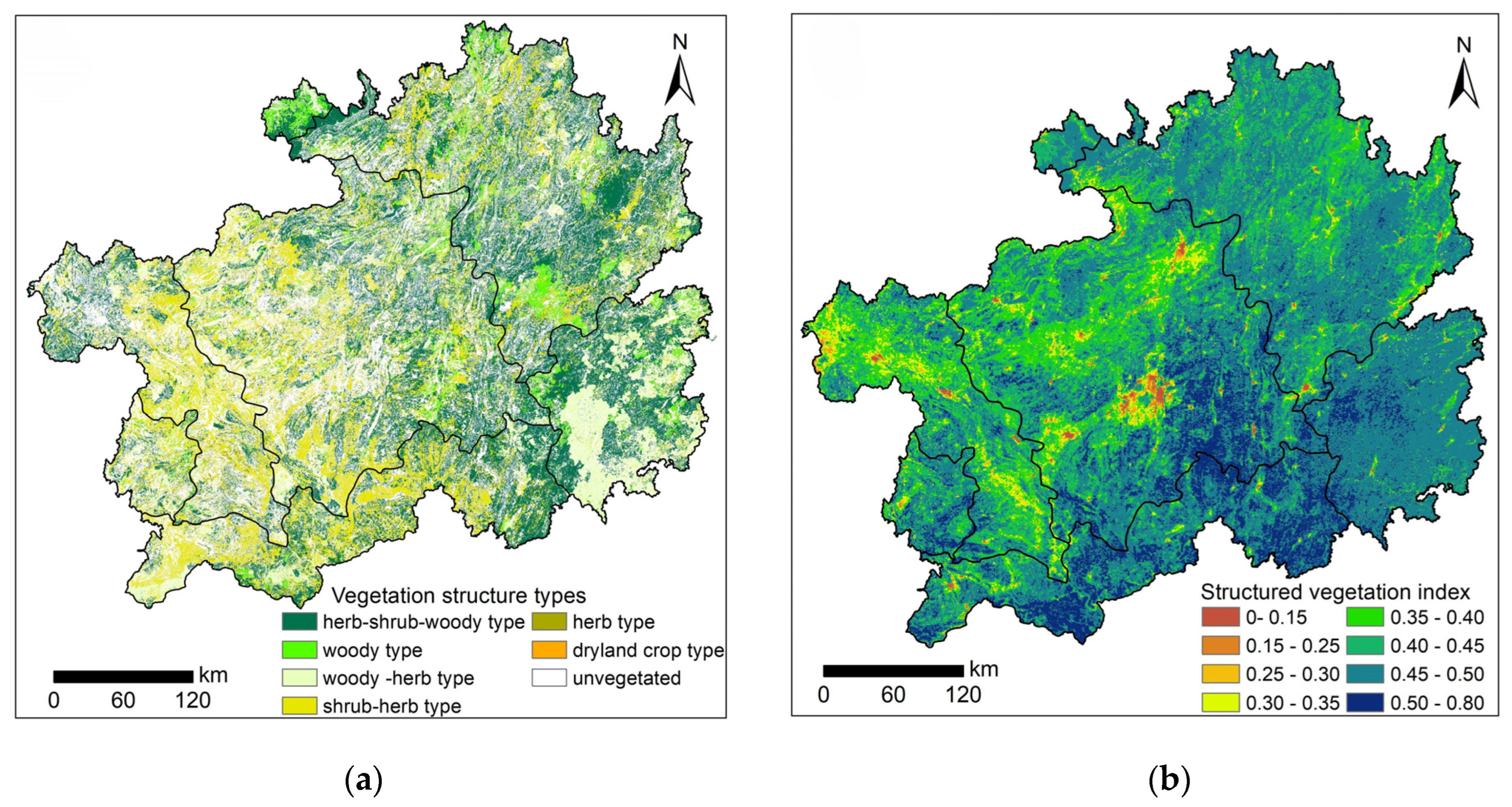 - Dai, Q.; Lin, J.; Zhu, Y.F.; Pan, Y.; Dong, B.; Xu, Y.Y. Remote sensing inversion of vegetation cover management factor based on the southern structured vegetation cover index. Sci. Soil Water Conserv. 2021, 19, 64–71. (In Chinese) [Google Scholar] [CrossRef]