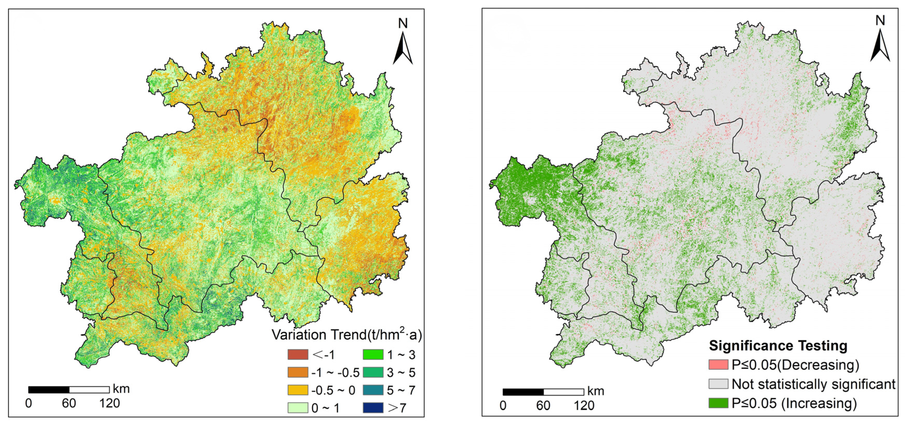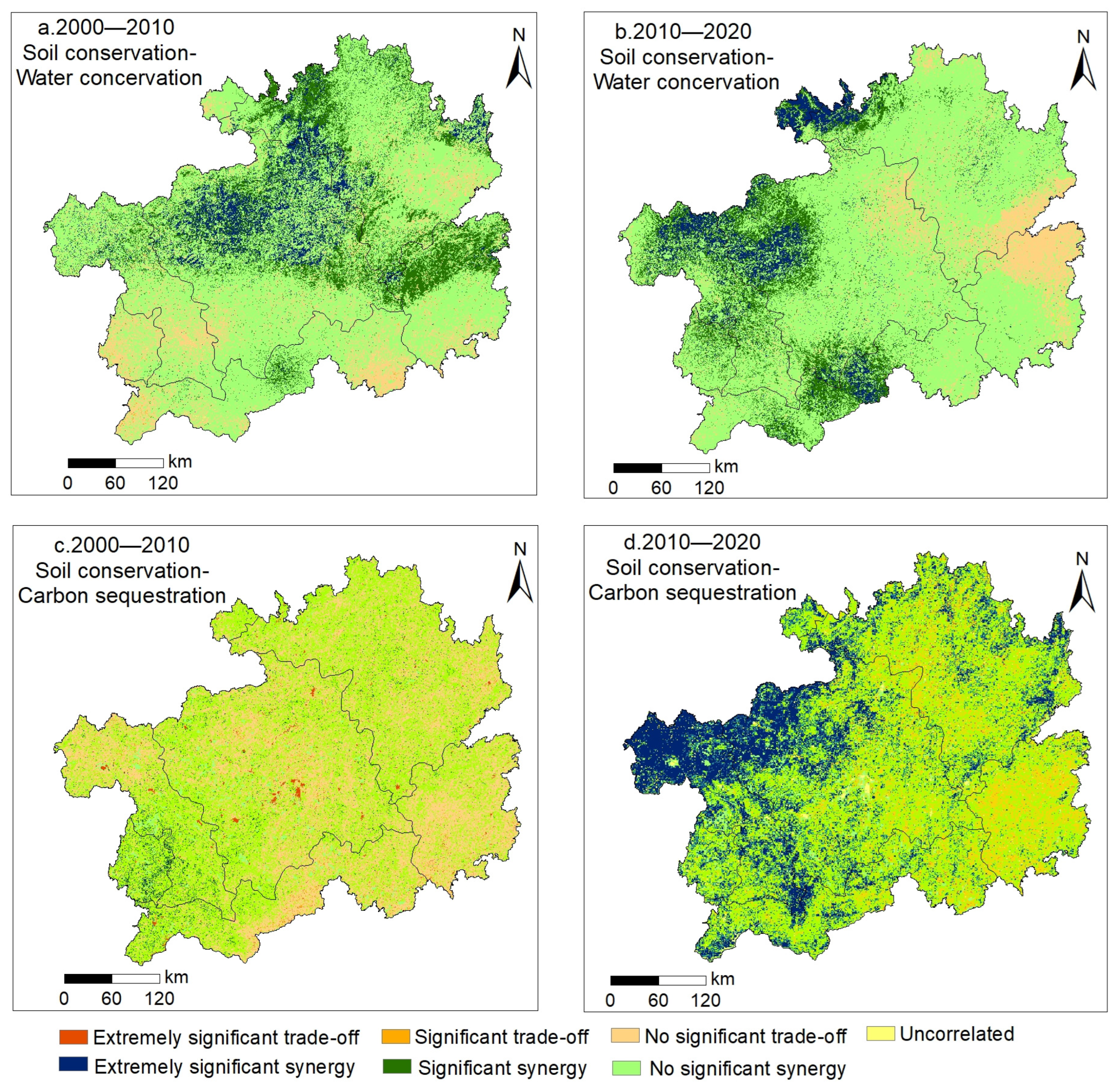 - Soil conservation service in the Guizhou Plateau exhibited an improving trend from 2000 to 2020.