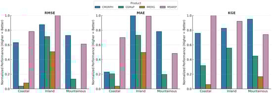 The regional comparison (Figure 2) provides an integrated view of the mean normalized performance of all four QPE datasets—MSWEP, CMORPH, IMERG, and GSMaP—across three physiographically distinct zones: Mountainous, Coastal, and Inland regions. The evaluation is based on three key metrics: RMSE, MAE, and KGE, where values were normalized so that higher scores indicate better performance. This figure serves to reveal the regional dependency of satellite rainfall retrieval skill in the UAE and highlights the influence of topography and proximity to the coast on QPE accuracy.