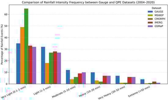 Figure 3 compares gauge observations with four QPE datasets—MSWEP, IMERG, CMORPH, and GSMaP across five rainfall intensity categories (Very Light, Light, Moderate, Heavy, and Extreme) during 2004–2020. The gauge data indicate that Very Light and Light rainfall events account for approximately 78% of total occurrences. In comparison, Moderate rainfall accounts for about 15%, and Heavy to Extreme rainfall accounts for less than 7%.