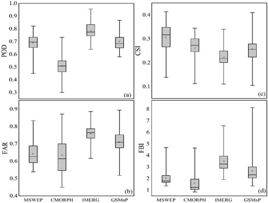 Boxplots for the categorical indices’ representation. (a) Probability of Detection (POD); (b) False Alarm Ratio (FAR); (c) Critical Success Index (CSI); and (d) Frequency Biased Index (FBI).