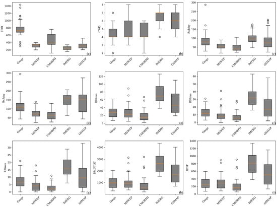 Boxplots of extreme precipitation indices for gauge observations, MSWEP, and three satellite products (CMORPH, IMERG, and GSMaP). The indices include (a) Consecutive Dry Days (CDD), (b) Consecutive Wet Days (CWD), (c) Rx1 day (maximum daily rainfall), (d) Rx5 day (maximum 5-day rainfall), (e) R10 mm, (f) R20 mm, (g) R30 mm (days with rainfall exceeding 10, 20, and 30 mm, respectively), (h) PRCPTOT (total precipitation), and (i) R95P (rainfall above the 95th percentile).